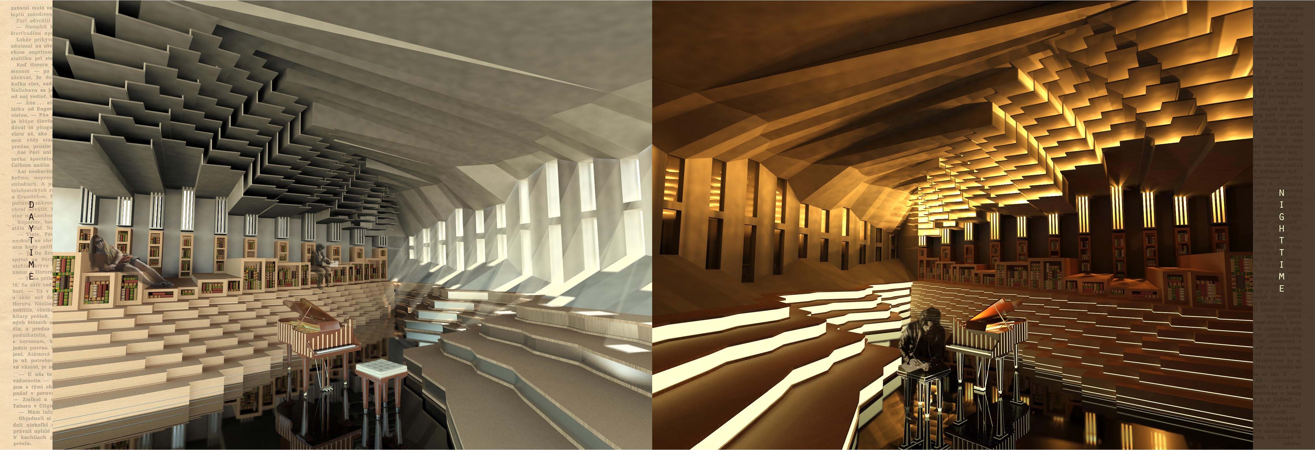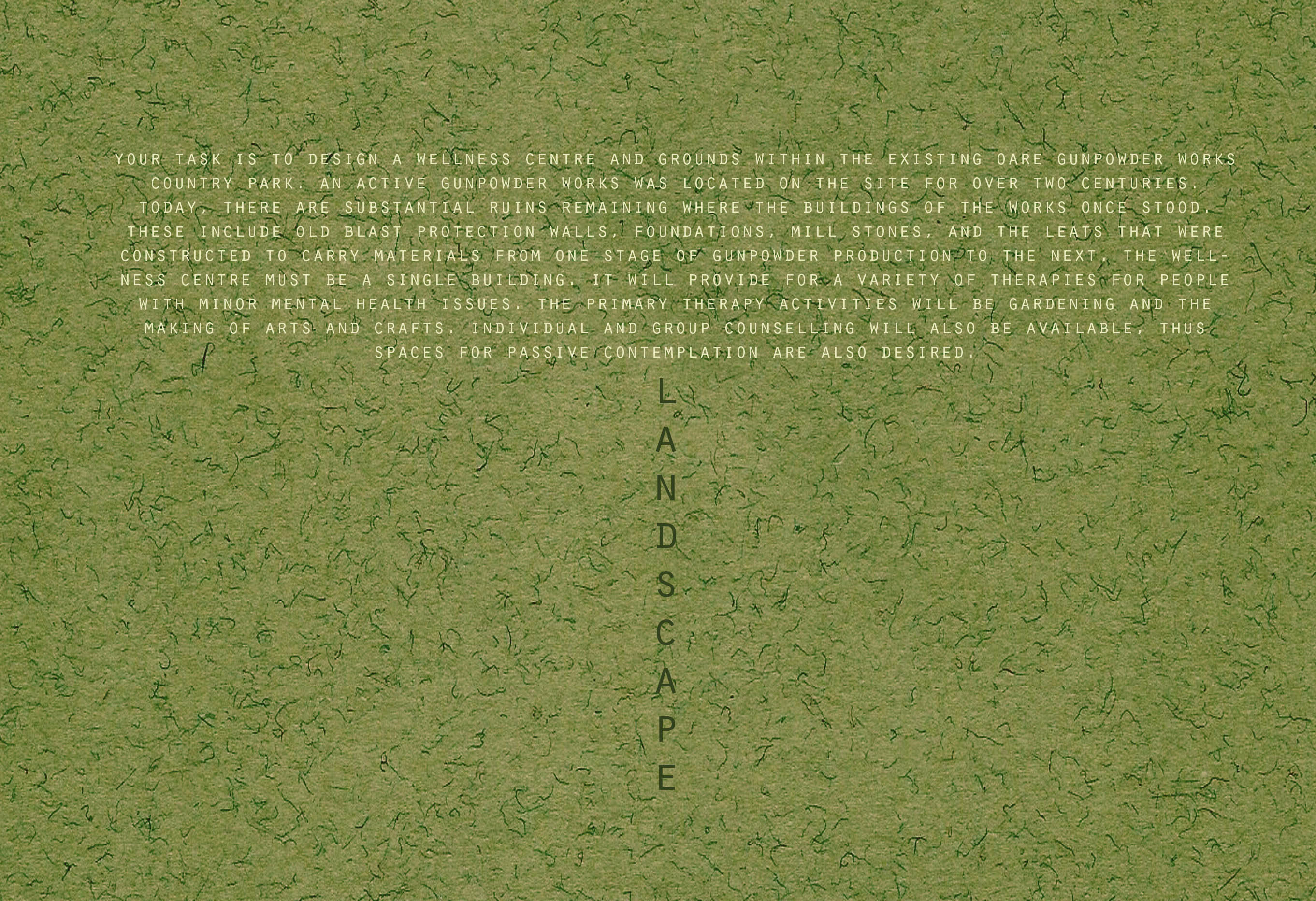 Gunpowder is fired from a gun (expressed with metal meshes springing up from the ground covered in black gravel) –> it reaches a thick double curved brick wall (all the original houses on the site were encircled with a brick blast wall in order to prevent a potential explosion from spreading) and punches a hole in it ( windows are scattered to the sides as a consequence of the explosion whereas at the back of the building, organized in the shape of sound waves evoking the noise)–> white concrete walls splay under the pressure in various directions and represent the cloud of smoke –> some of the end concrete walls are reproduced in timber and set further apart from the building ( like wooden pieces from the original buildings flying in the air) –> since the building buried in the ground, it symbolically creates a crater from which the garden slopes up. It is organized in pressure waves that are wider as the magnitude of the explosion decreases (only low plants in this area) until the whole process terminates (marked by wooden door hypothetically expelled from the passage creating a passage through it) and the vertical woodland garden starts.