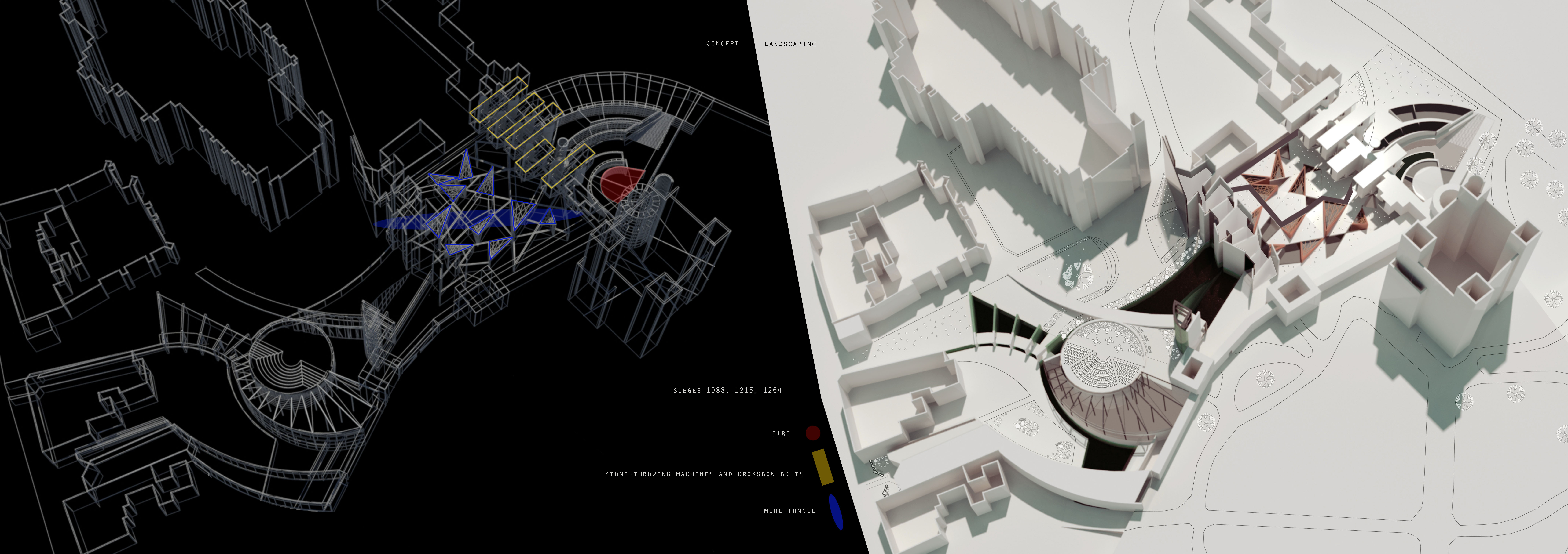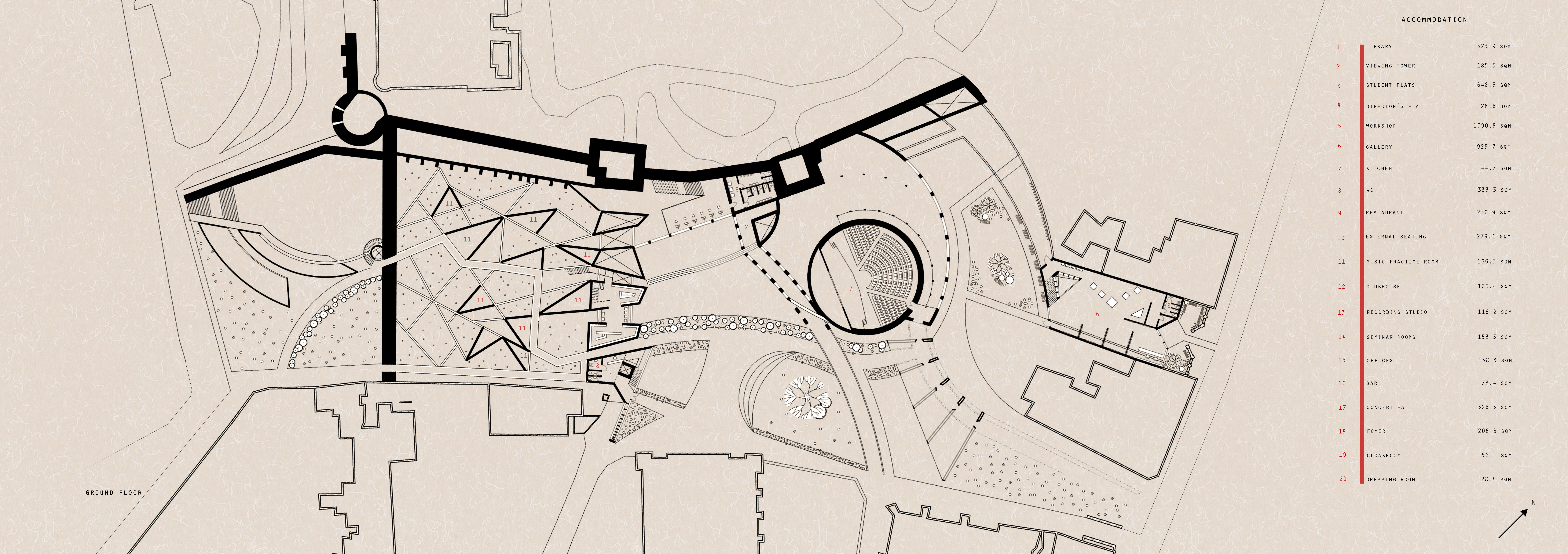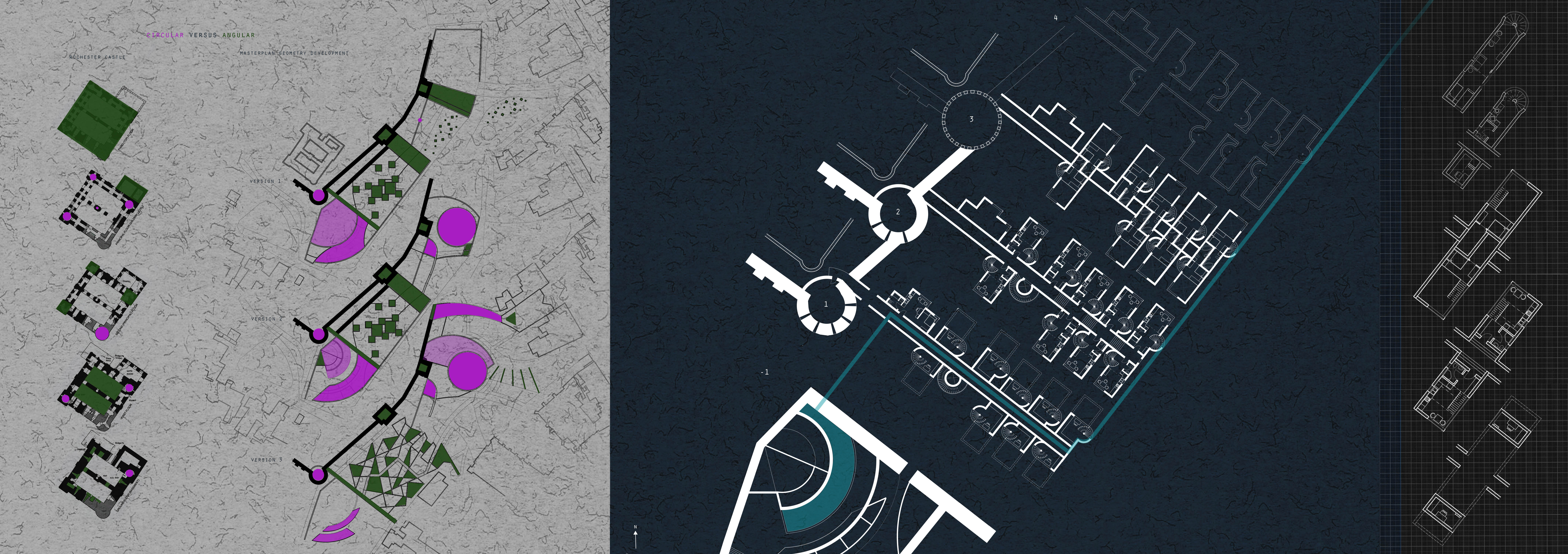 The development attempts to conceptually bring together Rochester´s historical and industrial side. The masterplan is derived from an analysis of sieges of the adjacent Norman castle with a building form representing different warfare strategies. Together with an incorporation of a former Roman wall, it thus serves an educational purpose and tries to find new modern ways of using historically important architectural elements. It engages the landscape by reintroducing water into a former castle ditch and honours the past by enhancing the perception of the existing historical monuments. Shipbuilding and nearby dockyards provide a precedent for rainwater collection, water level control mechanisms, wastewater treatment and for music practice rooms positioned on moveable platforms. The choice of materials such as weathering steel, glass and concrete also reflects area’s industrial heritage.