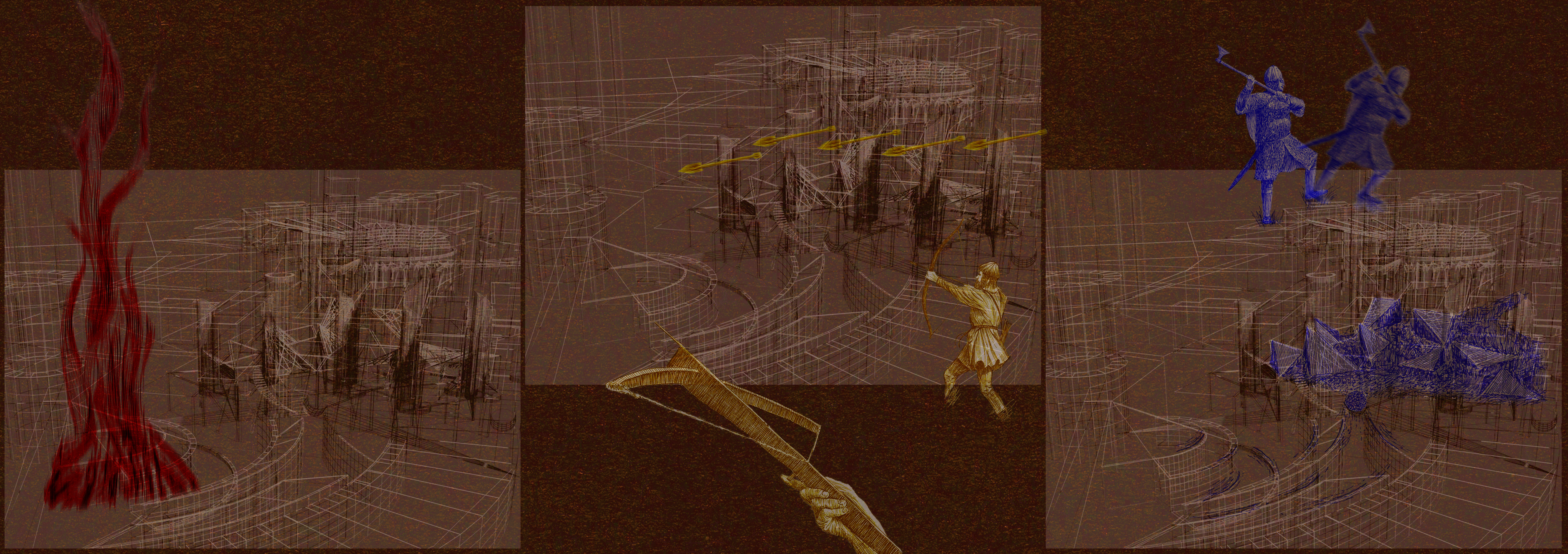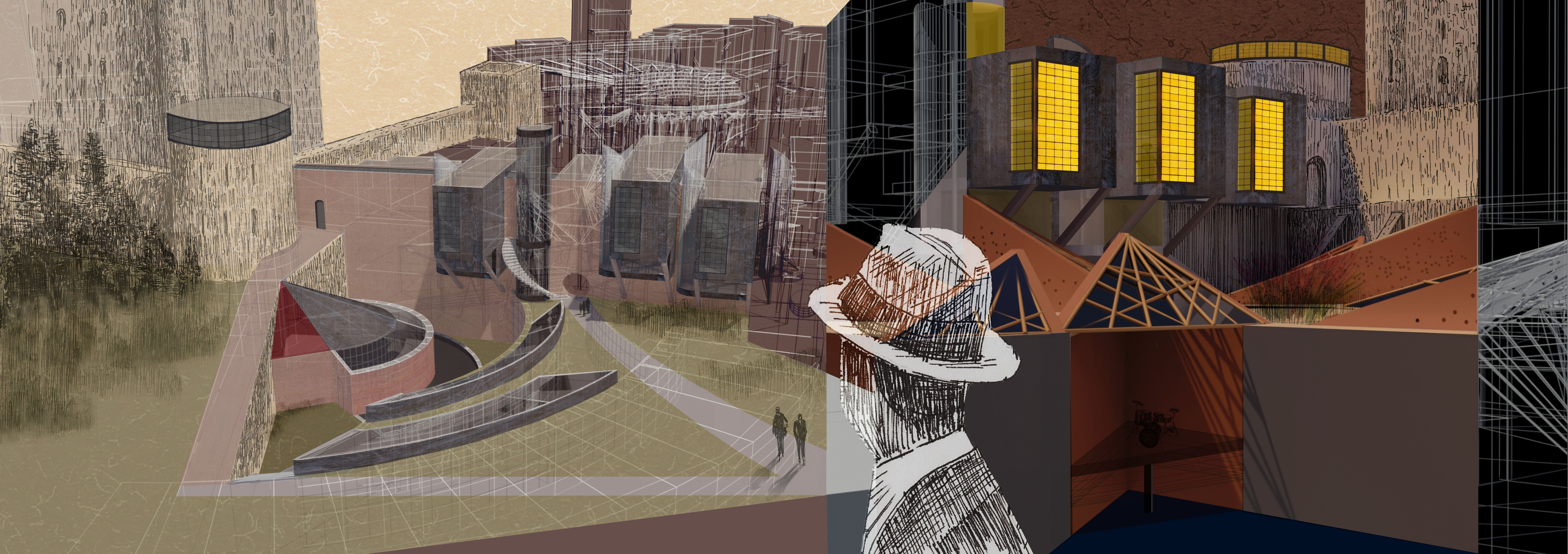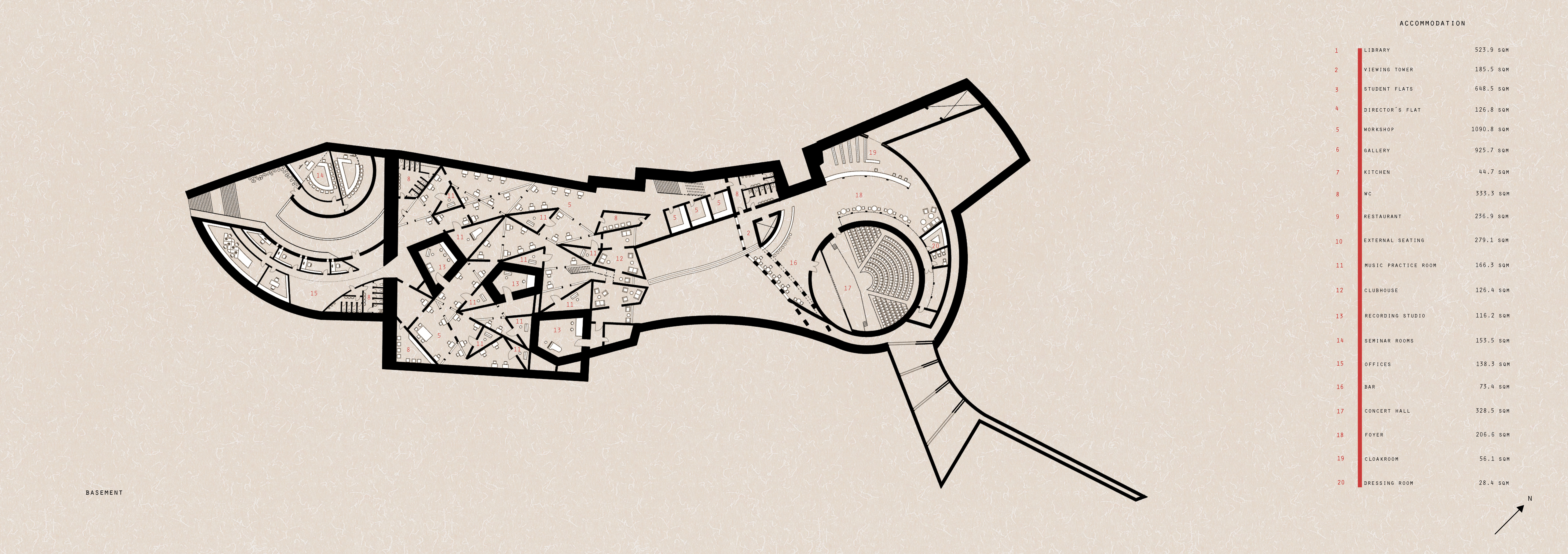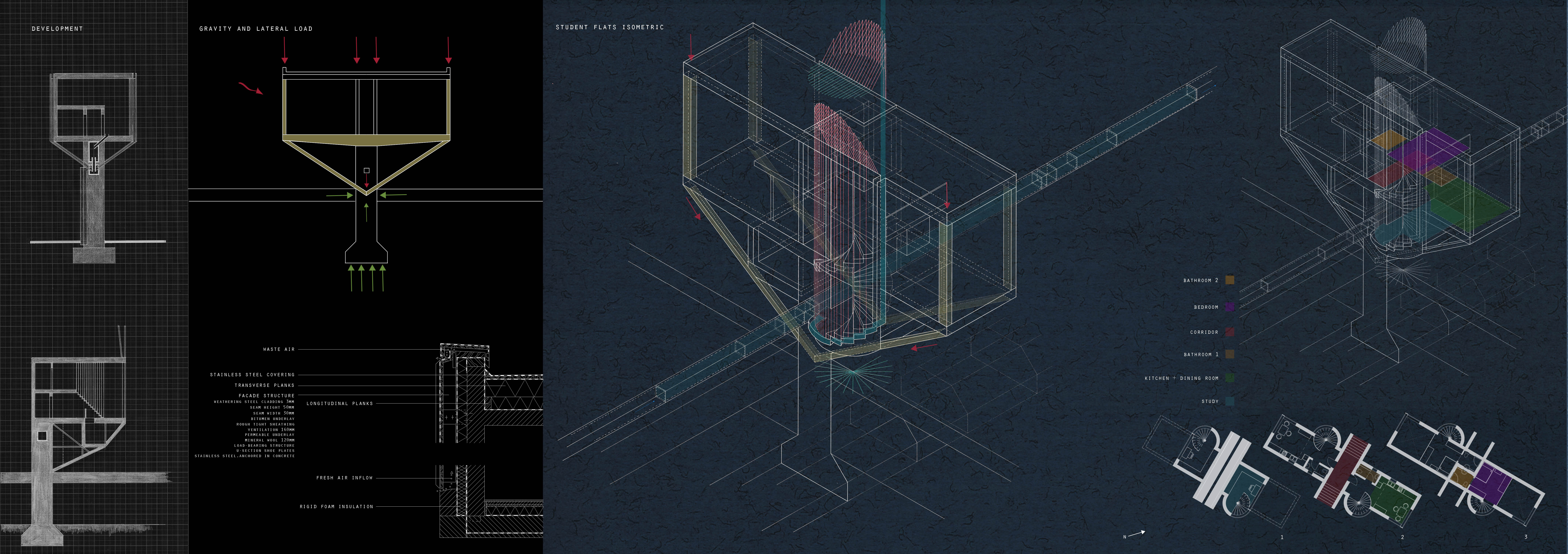 The development attempts to conceptually bring together Rochester´s historical and industrial side. The masterplan is derived from an analysis of sieges of the adjacent Norman castle with a building form representing different warfare strategies. Together with an incorporation of a former Roman wall, it thus serves an educational purpose and tries to find new modern ways of using historically important architectural elements. It engages the landscape by reintroducing water into a former castle ditch and honours the past by enhancing the perception of the existing historical monuments. Shipbuilding and nearby dockyards provide a precedent for rainwater collection, water level control mechanisms, wastewater treatment and for music practice rooms positioned on moveable platforms. The choice of materials such as weathering steel, glass and concrete also reflects area’s industrial heritage.