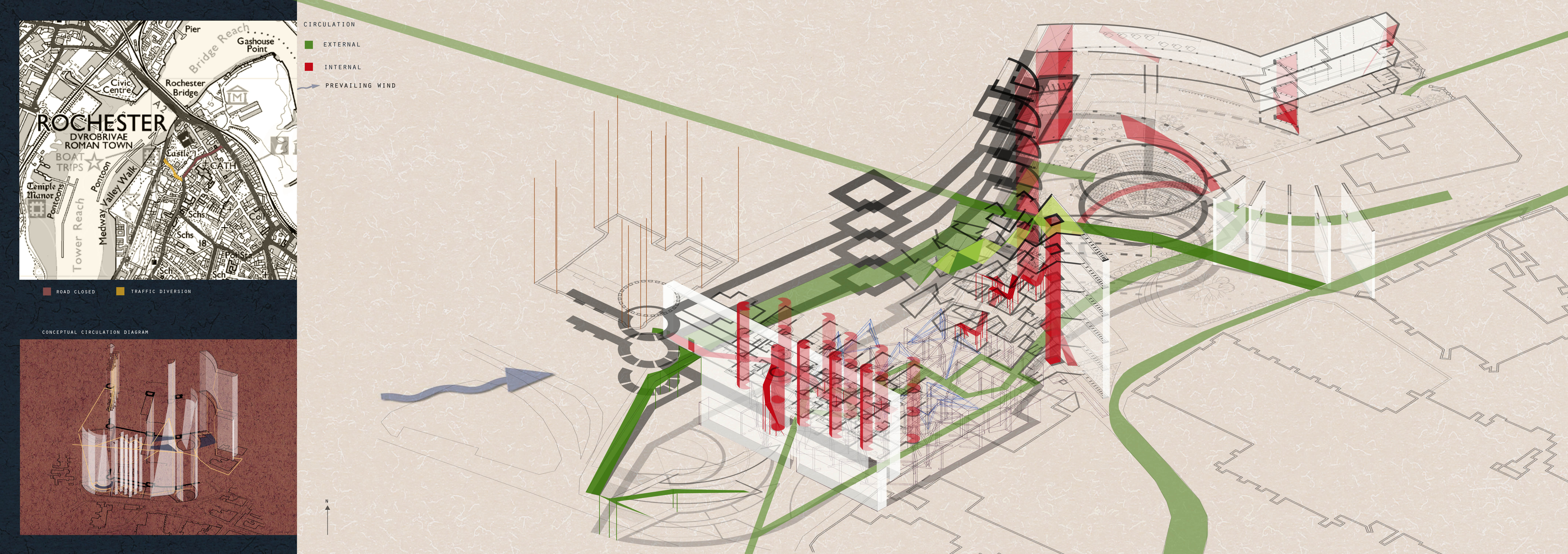 The whole composition is according to futurist principles seen as an organism, constantly in motion, intertwined with a number of circulation routes and interconnected through its insides. The site can be therefore discovered without the danger of being soaked by English rain. It attempts to abolish the importance of façade and provides a viewing tower and walk-on roofs enabling people to appreciate Rochester from a different perspective, as a whole composed of a myriad of architectural and natural fragments. Every part plays its practical and aesthetic role.